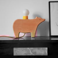FR - Une lampe aux formes douces et au design épuré. Du bois brut et de la couleur. Aussi bien pour apporté une touche original dans le salon que de douceur dans une chambre.
